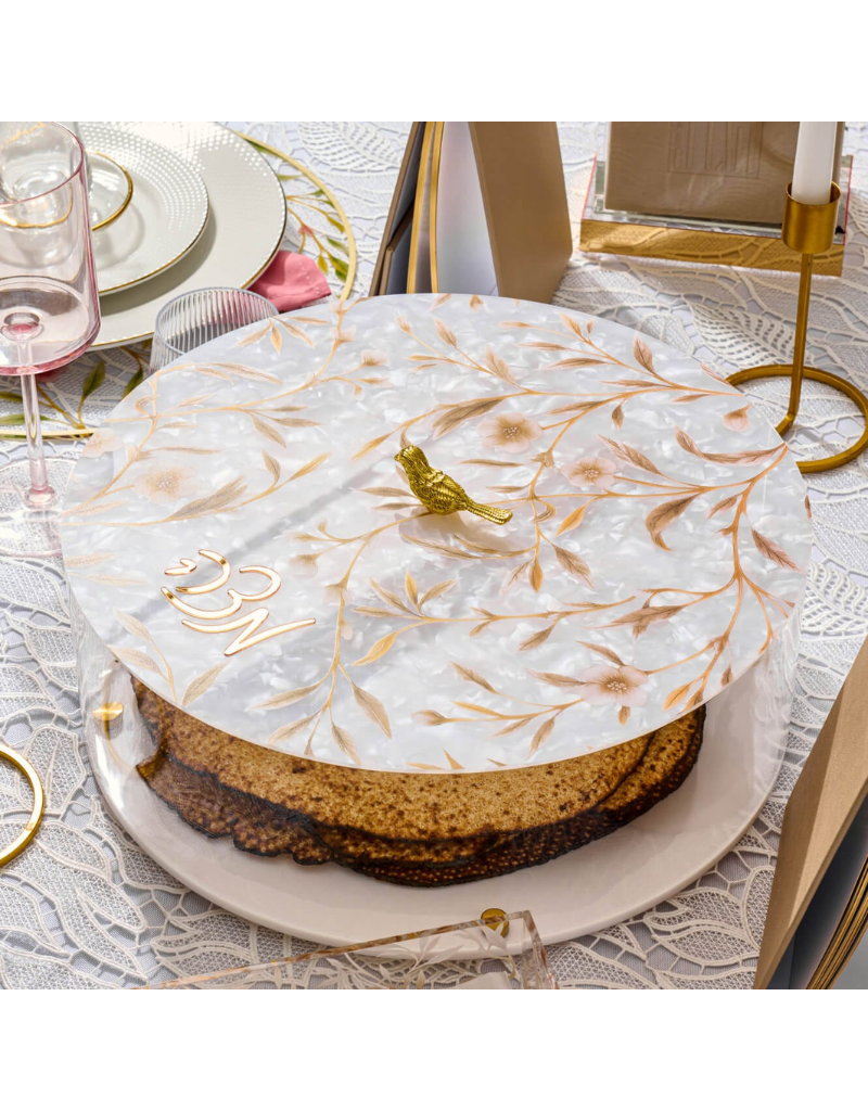 Add a touch of refined tradition to your Seder table with the Floral Bird Matzah Box - an elegant Pesach (פסח) essential designed to be both practical and breathtaking. Featuring a delicate floral vine motif and a charming bird accent on the lid, this piece brings a light, elevated beauty to your Seder (סדר) setting. The lid is finished with the Hebrew word מצה in graceful gold lettering, making it a meaningful centerpiece as well as a functional storage solution. Crafted in clear, polished lucite with a refined gold trim, this matzah box keeps your matzah protected, organized, and ready to serve - pairing beautifully alongside your Keara (קערה) and the rest of your holiday table décor.