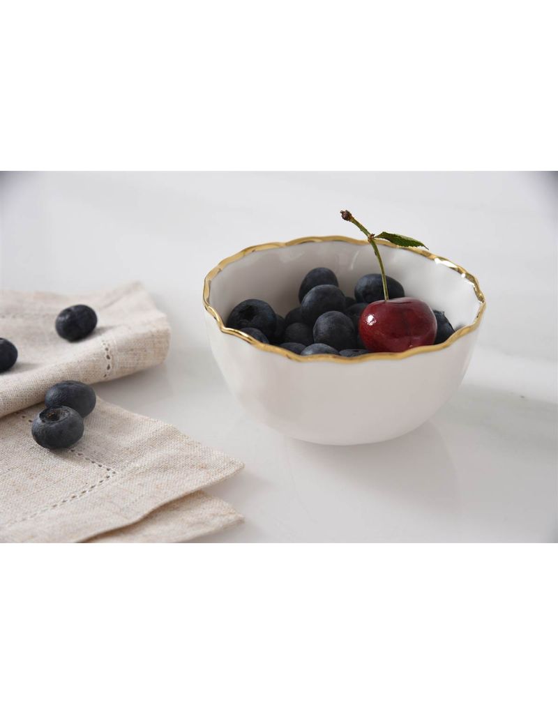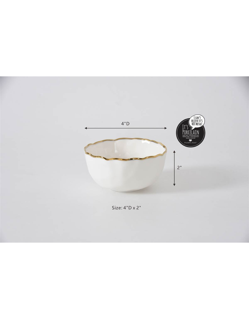 This elegant Mini Snack Bowl is crafted from pristine white porcelain, accented with a refined gold trim. Ideal for serving mixed nuts, berries, candies, dips, or individual portions, it enhances any occasion from casual snacking to sophisticated gatherings. Designed for convenience, it is food safe, tarnish-free, dishwasher safe, and oven safe up to 500°F, combining beauty with practical durability.