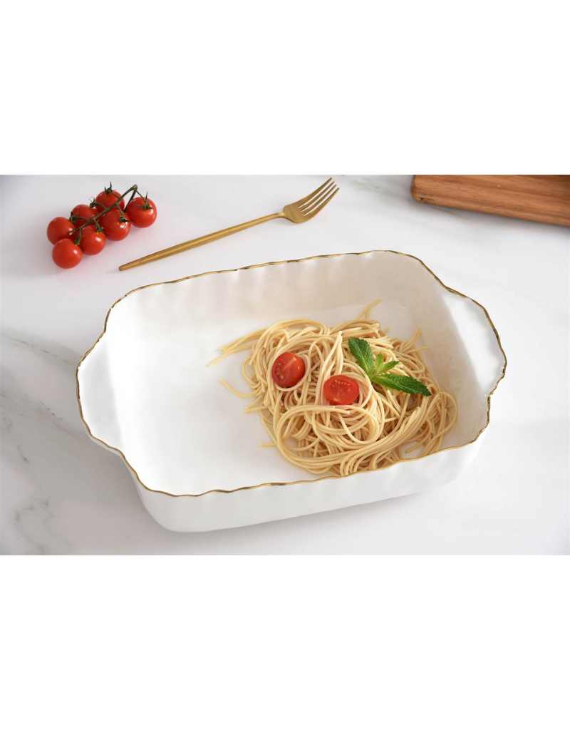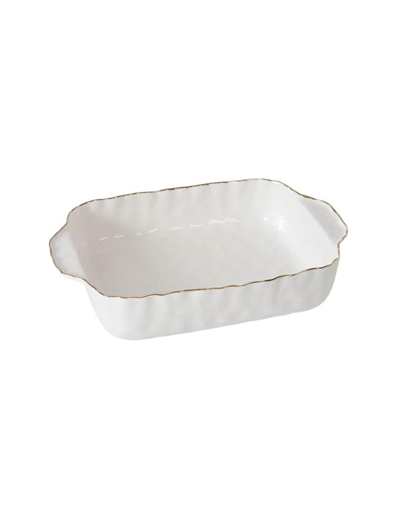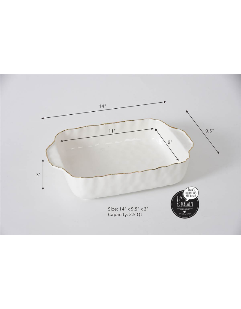 Elevate your culinary presentation with this elegant rectangular baking dish, crafted from pristine white porcelain accented by a delicate gold trim. Its generous 2.5-quart capacity is perfect for family-sized casseroles, lasagnas, roasted vegetables, and desserts. Designed with sturdy handles for a secure grip, it transitions effortlessly from oven to table. Safe for use up to 500°F, dishwasher friendly, and tarnish free, this baking dish combines timeless style with practical durability for refined everyday cooking.