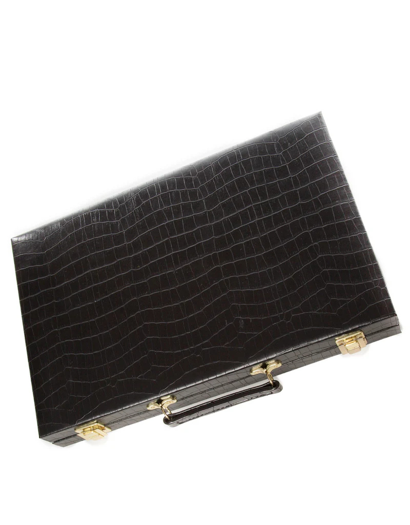 A classic game in a contemporary case. Add backgammon to your collection in this custom vegan leather case with velvet lining. Features this luxurious briefcase which comes with dice and chips and velvet lined game base.