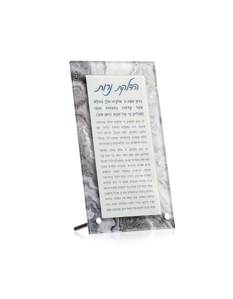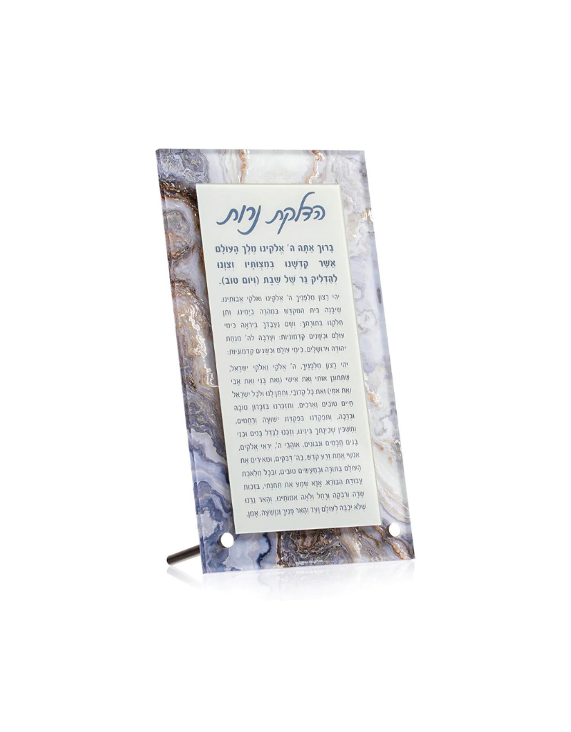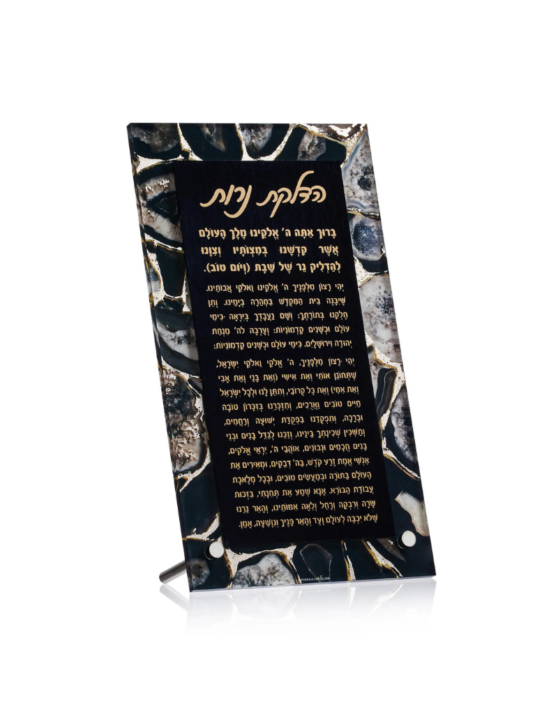 This agate hadlakat neirot stand features a natural stone print on thick lucite, metallic embellishments, and another layer of lucite on top with an easy to read print. Freestanding & sleek, makes a stylish addition to your candle lighting.