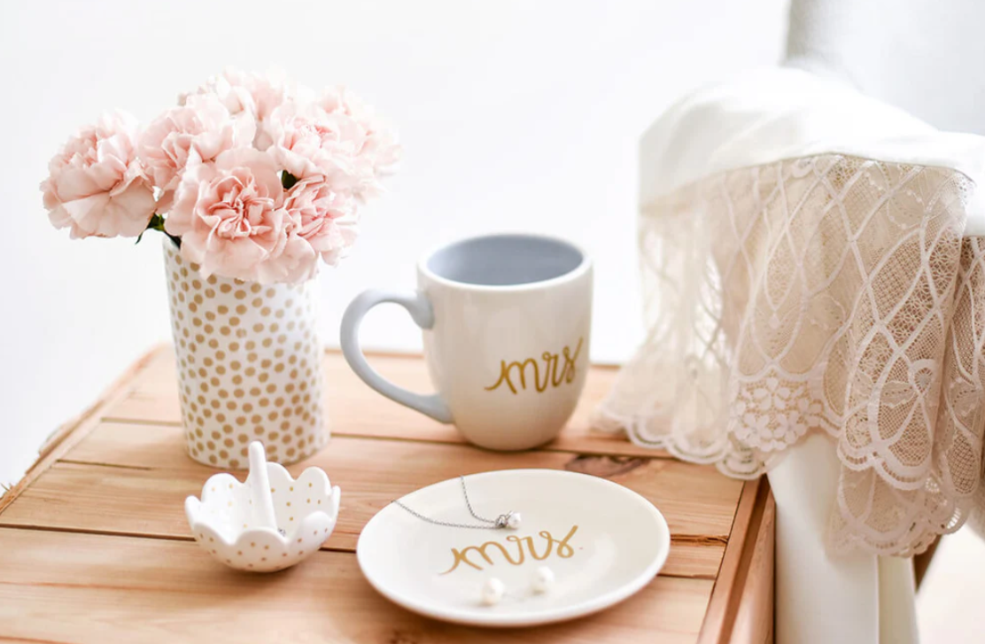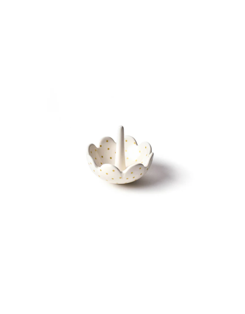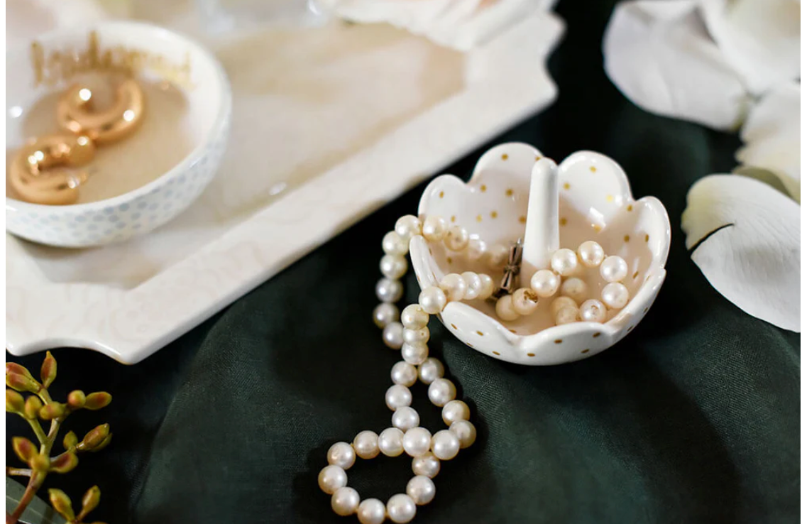 Keep your jewelry safe and organized with our Gold Swiss Dot Scallop Ring Dish. This elegant jewelry dish is the perfect addition to any dresser or vanity. It also makes a great gift for a newly engaged friend, helping them keep their precious ring safe and sound.