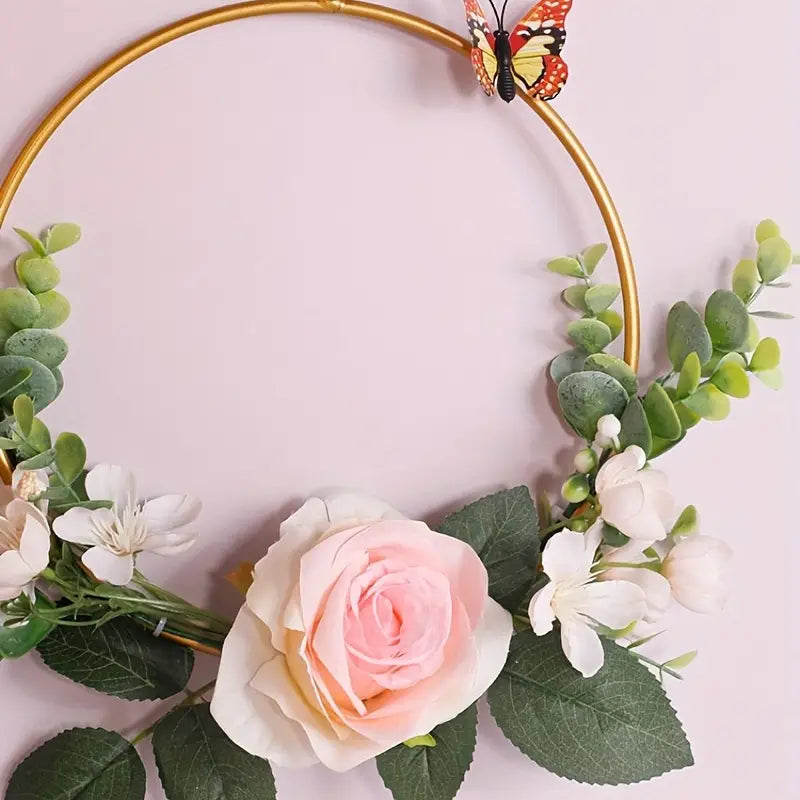 This beautiful wreath of delicate peonies and roses, ensconced in a gold metal ring, will lend an enchantment to your home. Let the soft curves and subtle colors bring a whisper of luxury to your space, with its timeless appeal that will last for years.