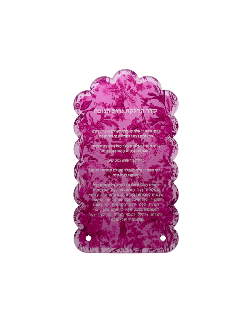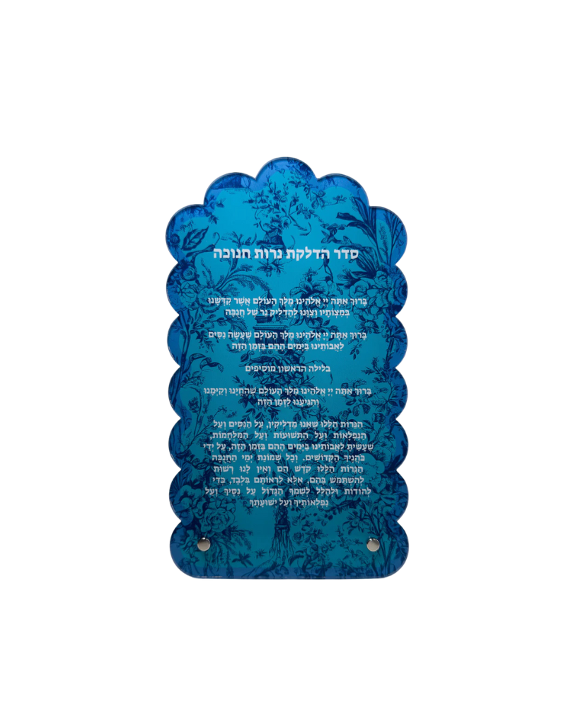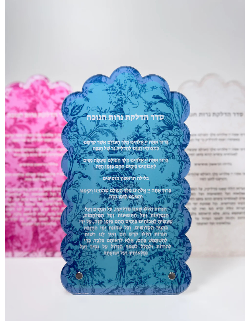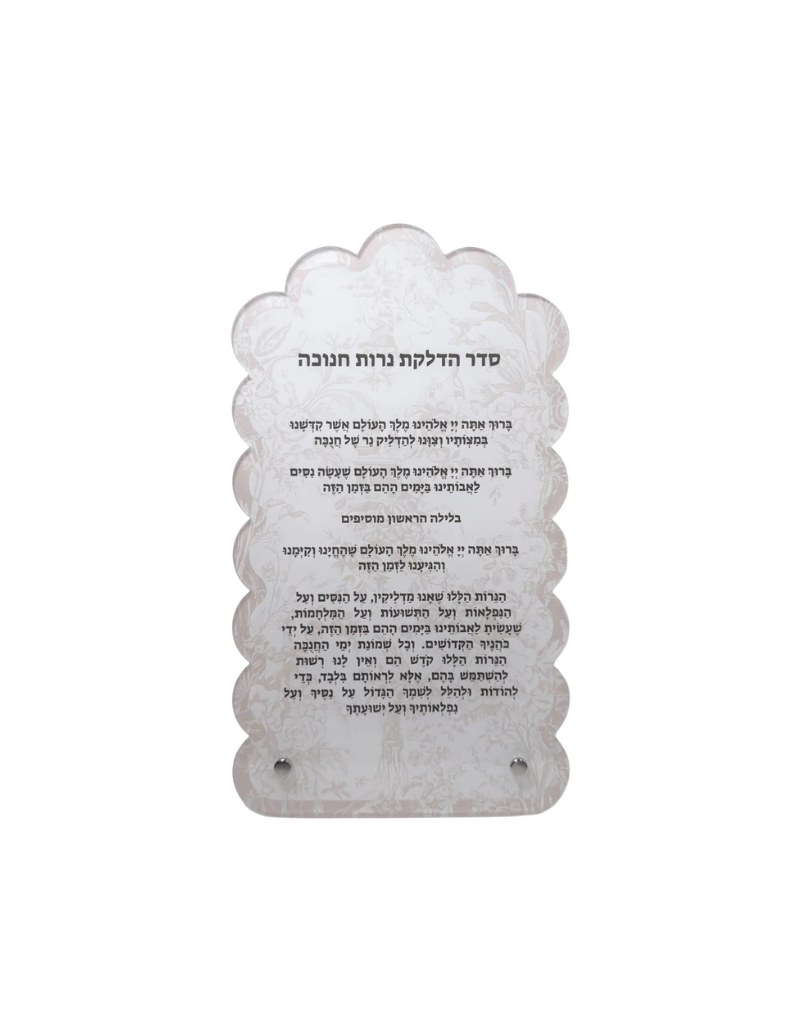 Experience the artistry and elegance of Chanukah with our exclusive Brachos Card. Crafted from durable acrylic, with a captivating French Toile design, this card is both functional and visually stunning. Its metal stands add stability, making it the perfect addition to your holiday decor.