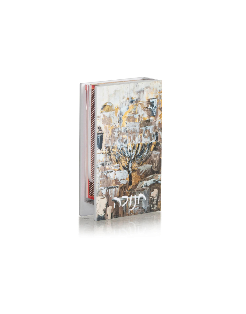 This unique matchbox holder is a gorgeous must-have by your Chanukah candle lighting. Includes the full Chanukah Brachot on the back. Swipe the match without needing to remove the matchbox. Coordinate this masterpiece with the Chanukah Menorah, tray, card, or tabletop plaque.