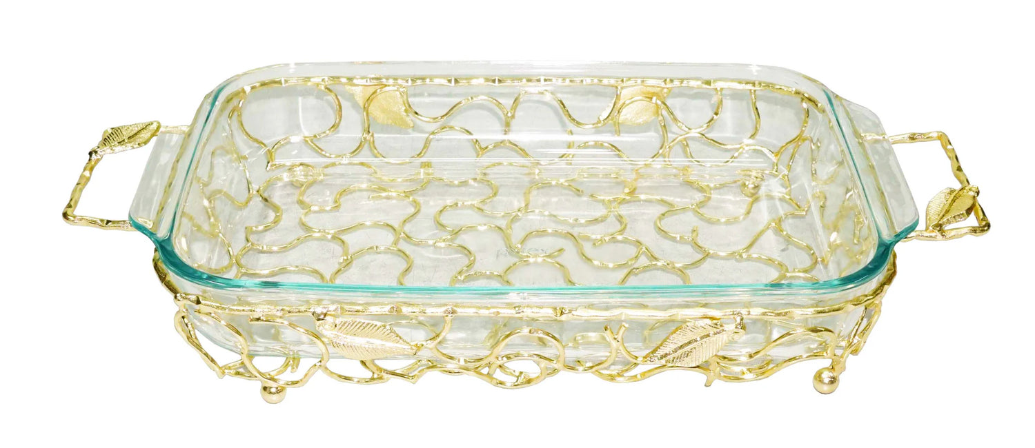 Elevate your serving experience with this Rectangular Pyrex Holder, featuring elegantly crafted gold handles and a delicate leaf design. Combining timeless style with practical functionality, it provides a secure grip while enhancing the presentation of your baked dishes. Perfect for sophisticated gatherings, it merges durability with refined aesthetics.
