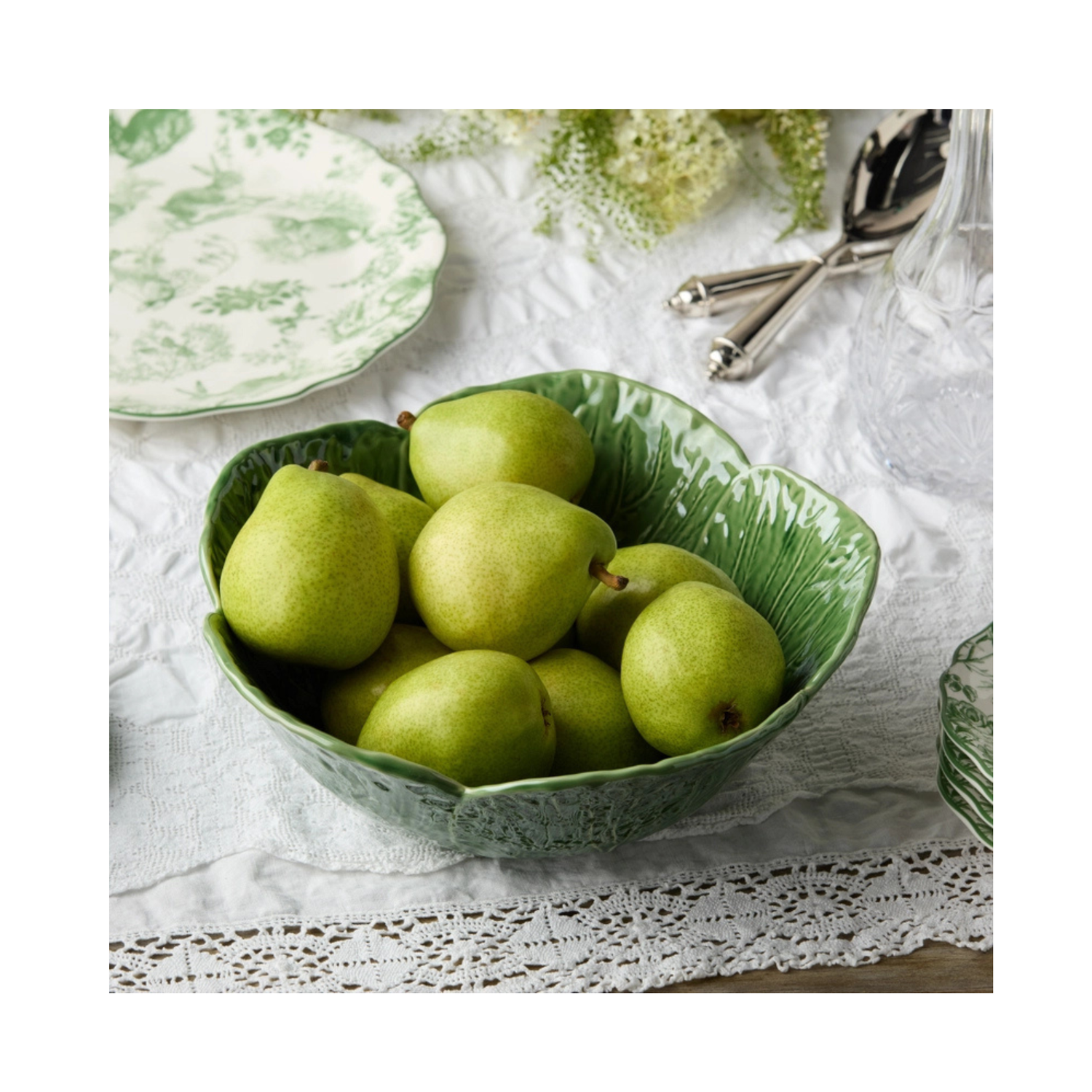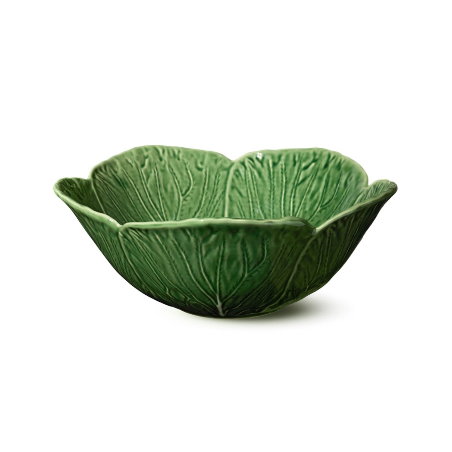This hand-sculpted ceramic bowl mimics a cabbage leaf in full bloom, complete with rich green glaze and delicate white veining. A playful yet elegant serving piece that works beautifully for salads, pasta, fruit, or shared dishes. Its sculptural form and dramatic flared rim make it a standout on any table—functional art for those who love garden-inspired design.