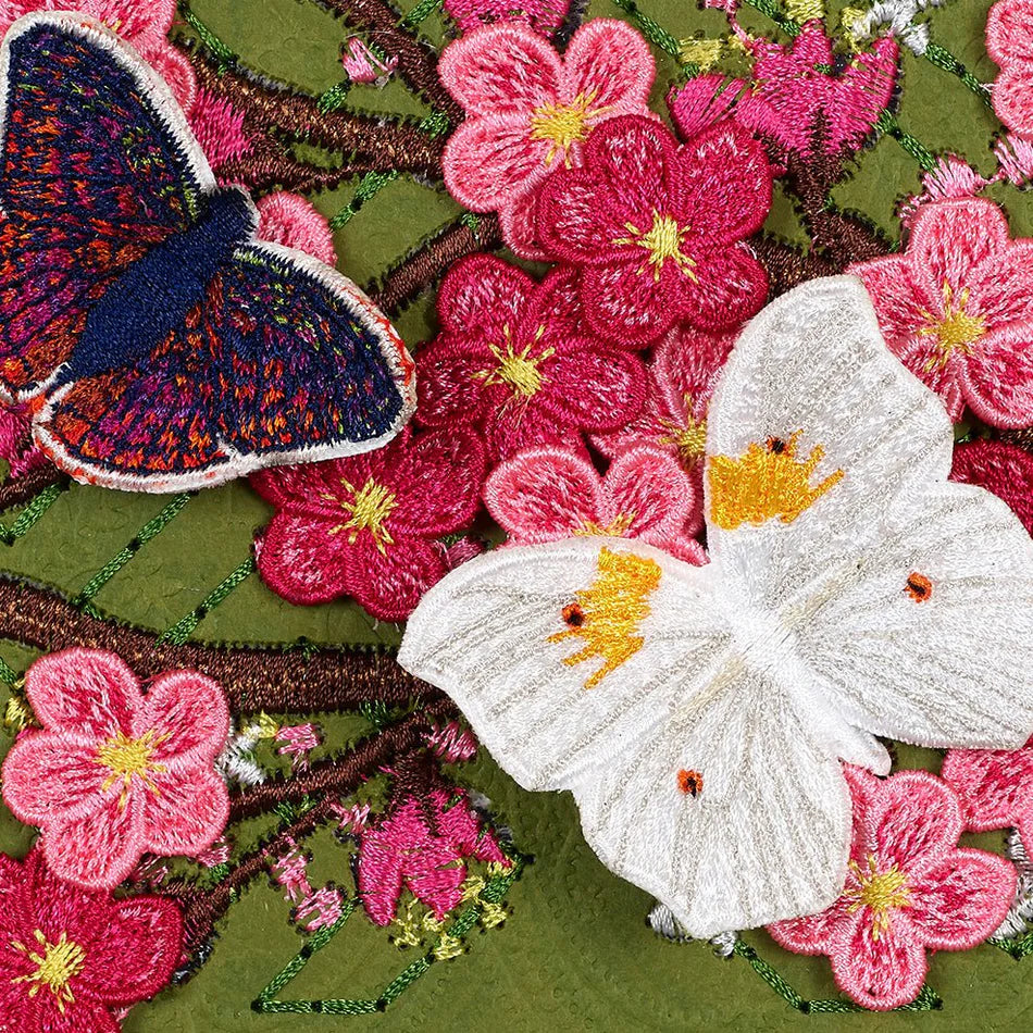 The Cherry Blossom pieces are among the most beloved at the studio. The piece starts with an embroidered luxury bag. The embroidery is stitched directly through the box using tonal thread to create the base of the cherry tree. Embroidered lace flowers are then collaged onto the box for more dimension and embroidered butterflies are added as a final touch.